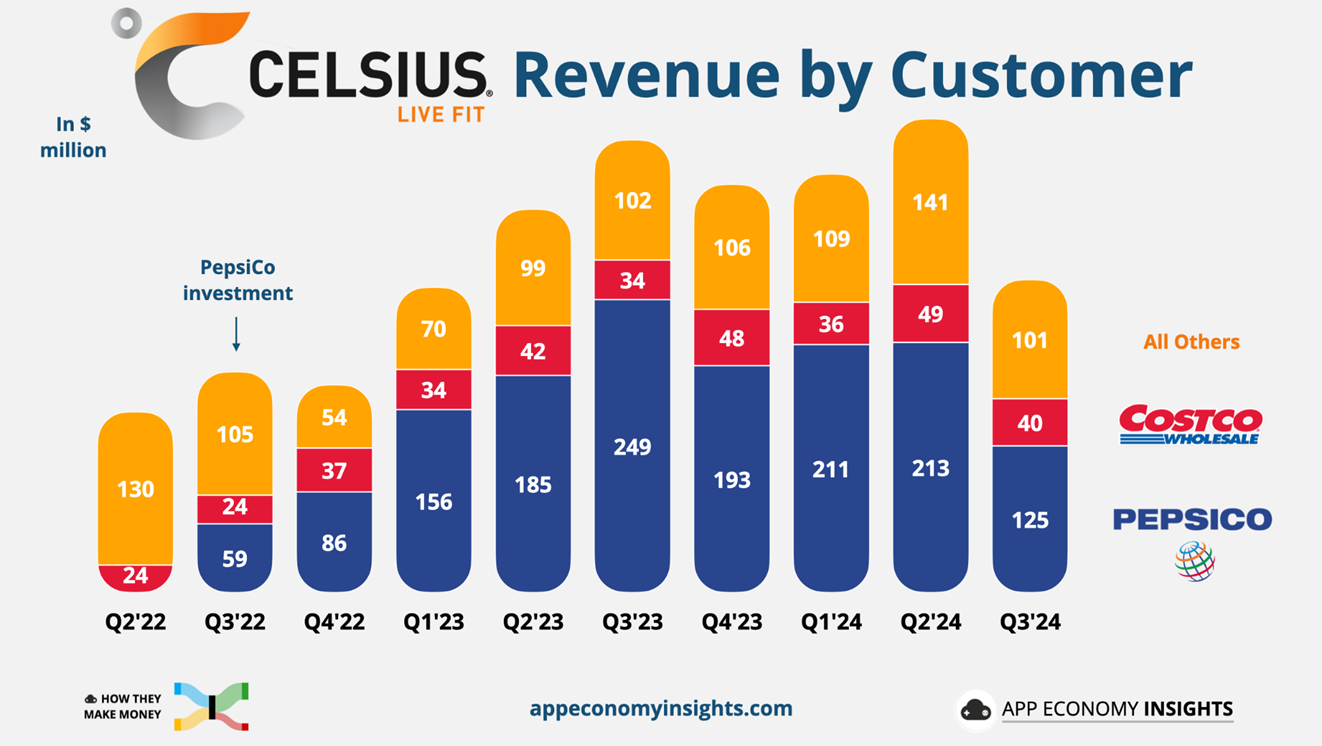 지분 투자 이후 셀시어스 매출에서 펩시가 차지하는 비중이 60%에 달하게 되었는데, 펩시가 재고 조정에 들어가자 셀시어스 매출이 꺾여버린 것이다. 아래 차트에서 보이듯 4Q23부터는 매출 QoQ 성장이 꺾였다.