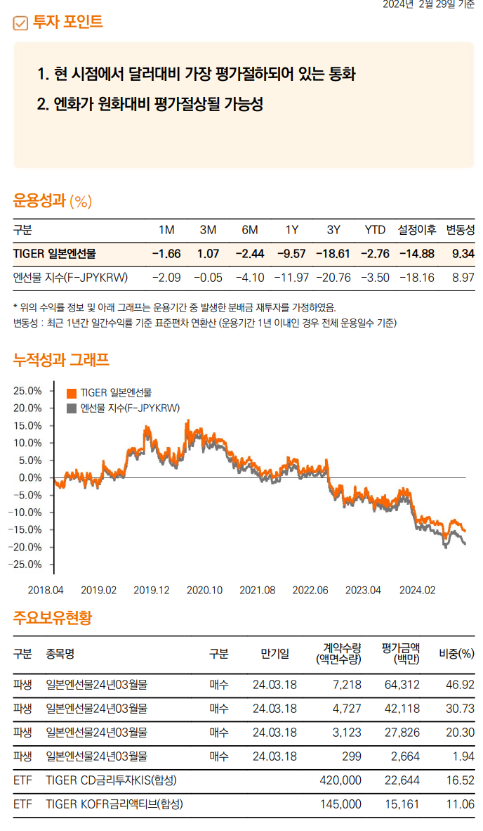 국내 유일하게 엔화에 투자할 수 있는 ETF는 미래에셋자산운용의 'TIGER 일본엔선물'이다. 관련 ETN도 있지만 신용위험과 거래량면에서 제외하겠다.