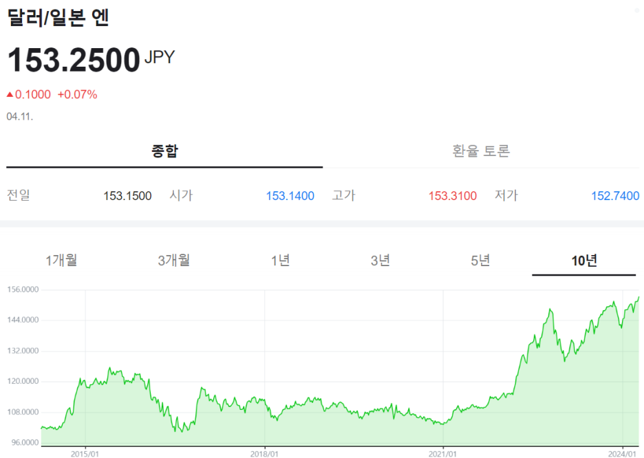 그런데 코로나 이후 높은 인플레이션을 잡기 위해 미국과 그 외 나라들은 기준금리를 급격하게 인상한 반면, 일본은 완화적인 통화 정책을 그대로 유지했다. 그러면서 미국과 일본의 금리 갭이 커졌고, 글로벌 자본이 엔화 자산을 매도하고 달러 자산으로 흘러들어가게 되었다. 엔화가 원화 대비 보다도 달러 대비 더욱 약세를 보인 이유다.