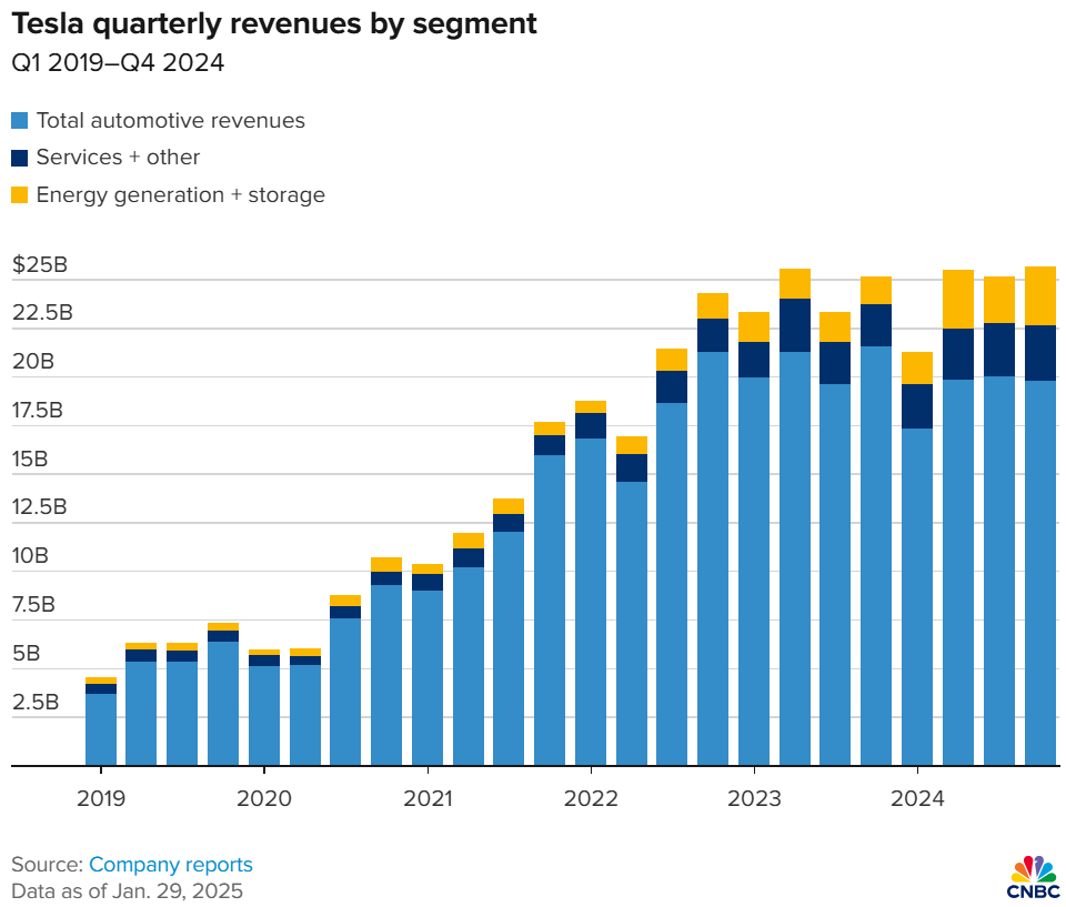 테슬라의 4분기 매출은 258억 달러로 8% 감소했고, 영업이익은 16억 달러로 23% 감소해 컨센서스를 하회했다. 특히 전기차 매출은 실적 공개 이후 처음으로 전년 대비 감소한 점이 눈에 띈다.