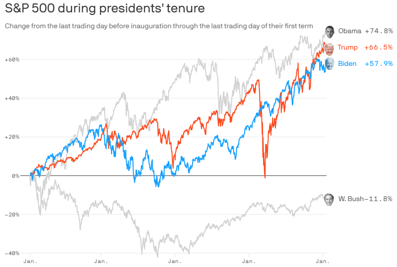 S&P500, 다우존스, 나스닥 모두 트럼프 첫 임기 동안 바이든 임기보다 더 큰 폭으로 상승했다. S&P500은 트럼프 집권 기간 동안 66.5% 상승했으며, 바이든 집권 기간에는 57.9% 올랐다. 결론적으로, 미국 주식 시장은 두 기간 모두 좋았다.