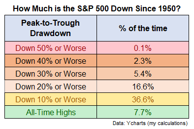 1950년 이후 S&P 500이 고점 대비 얼마나 자주 특정 수준 이상 하락했는지를 보면: