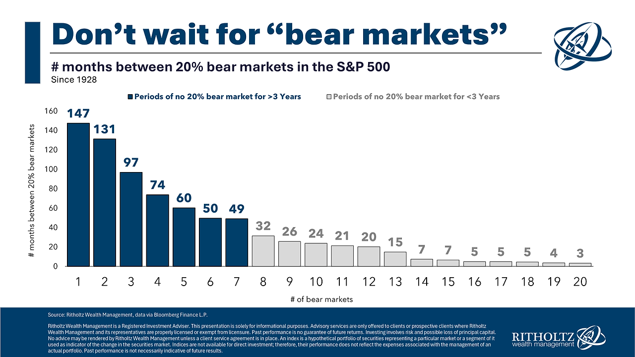 역사적으로 하락장(20% 이상 하락) 간격이 3년 이상이었던 경우가 7번 있었다. 무려 12년 동안 하락장이 없었던 시기(1987~2000년)도 있다. 만약 당신이 20% 하락을 기다리고 있었다면, 12년 동안 투자 기회를 놓쳤을 것이다.